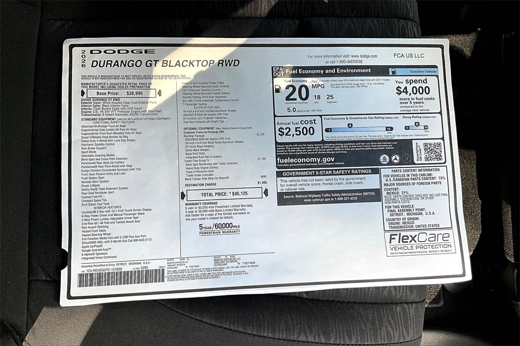 White Knuckle Clearcoat 2026 Dodge Durango GT RWD 8-Speed Automatic 3.6L V6 24V VVT