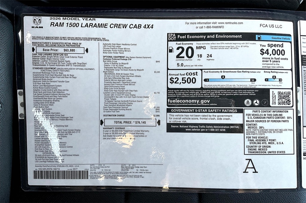 New Price! Bright White Clearcoat 2026 Ram 1500 Laramie 4WD 8-Speed Automatic 3.0L I6 1500 Laramie, 4D Crew Cab, 3.0L I6, 8-Speed Automatic, 4WD, Bright White Clearcoat, Black Leather. Prices do not include Tax, Title, License and Documentary Fee. Price does include: $3500 - 2026 National Retail Consumer Cash . Exp. 02/02/2026