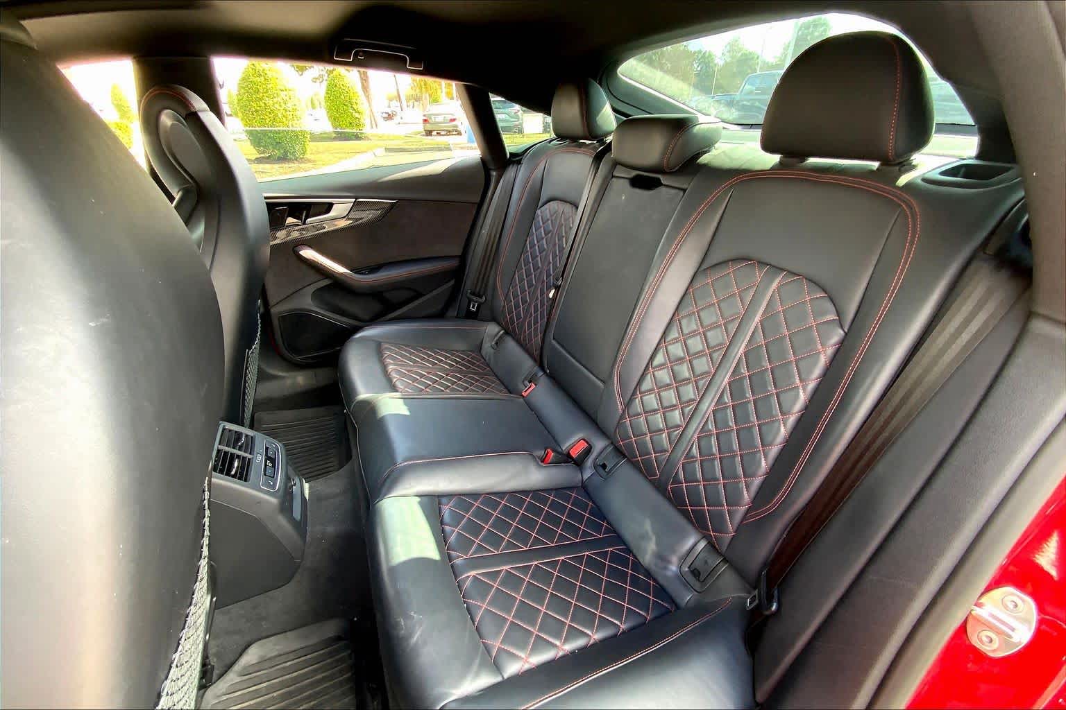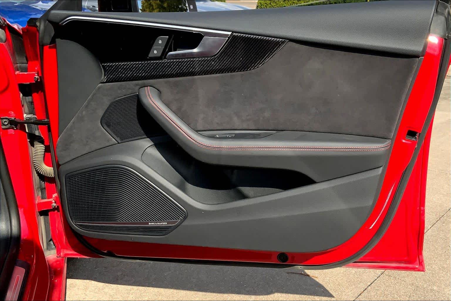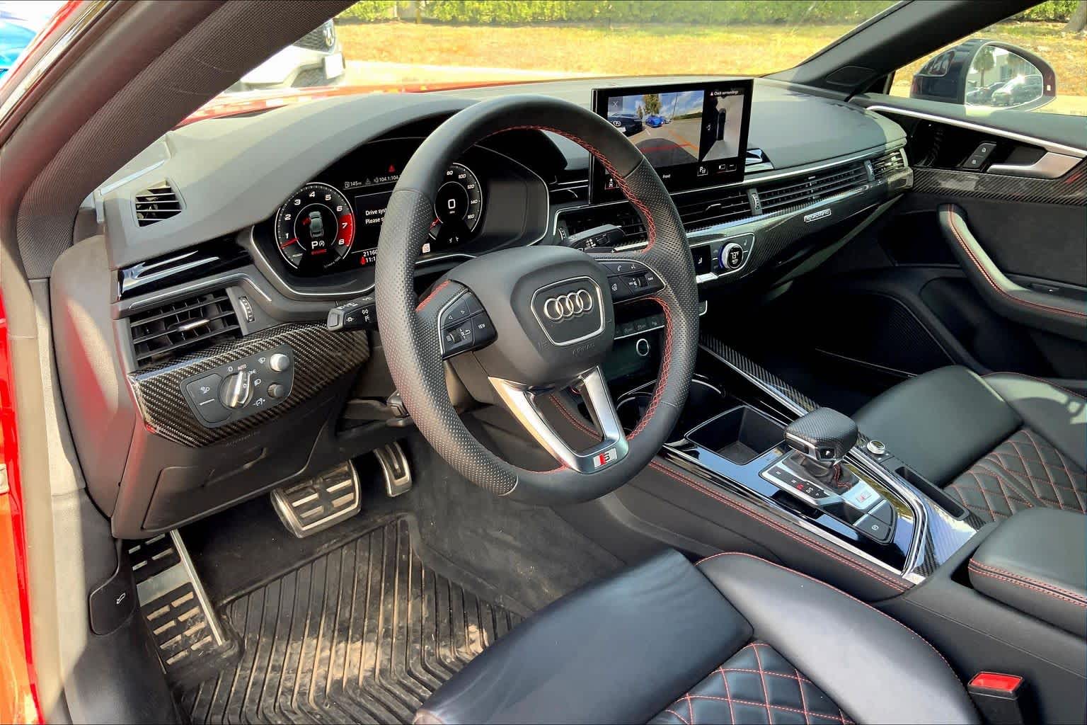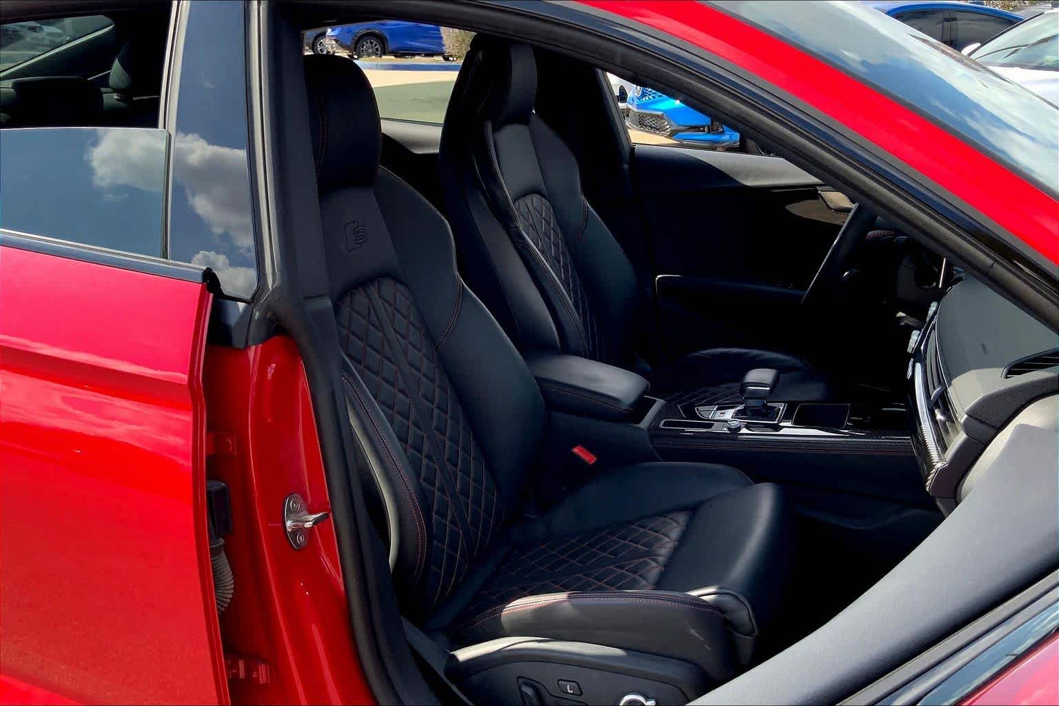 • PROGRESSIVE RED METALLIC ,BLACK, FINE NAPPA LEATHER SEATING SURFACES ,AUDI GUARD ALL-WEATHER MATS -inc: front and rear set of black rubber mats (4), Front set features S5 logo (PIO) ,BLACK OPTIC PLUS PACKAGE -inc: Black Exterior Mirror Housings & Exhaust Tips, Wheels: 20 5-Twin-Spoke Polygon Design, Bi-color finish, Tires: 265/30R20 94Y XL Summer, Black Rear Lip Spoiler, Black Fender Badges, Black Exterior Trim, Black Audi Rings & Badges ,S SPORT PACKAGE -inc: Sport Adaptive Damping Suspension, Red Brake Calipers, Sport Rear Differential ,AUDI S BEAM -inc: lower door trim LED light displaying S logo, Front doors only (PIO) ,SPORT EXHAUST RESONATOR (PIO) ,PRESTIGE PACKAGE -inc: LED Interior Lighting Plus Package, door trim contour and color options, Wireless Phone Charging Pad, Power Folding Exterior Mirrors, 2 Rear USB Charge Ports, Top View Camera System, Heated Rear Seats, Alarm System w/Motion Sensor, Auto-Dimming Exterior Mirrors w/Memory, SiriusXM w/360L, 3-month Platinum Plan trial subscription, Audi Advanced Key, keyless engine start/stop and entry, doors and trunk, Audi Side Assist w/Pre Sense Rear, Driver Seat Memory, Animation for Headlights & Taillights, MMI Navigation Plus, Traffic Sign Recognition, Audi Connect NAV & PLUS, Audi app store and 6-month trial subscription, Audi Laser Light & Headlight Washers, Leatherette Covered Center Console & Door Armrests, Bang & Olufsen Sound System w/3D Sound, Head-Up Display, Audi Virtual Cockpit Plus, Park Assist, parking entry functionality ,AUDI SPORT INTERIOR PACKAGE -inc: crescendo red stitched interior and RS carbon inlays