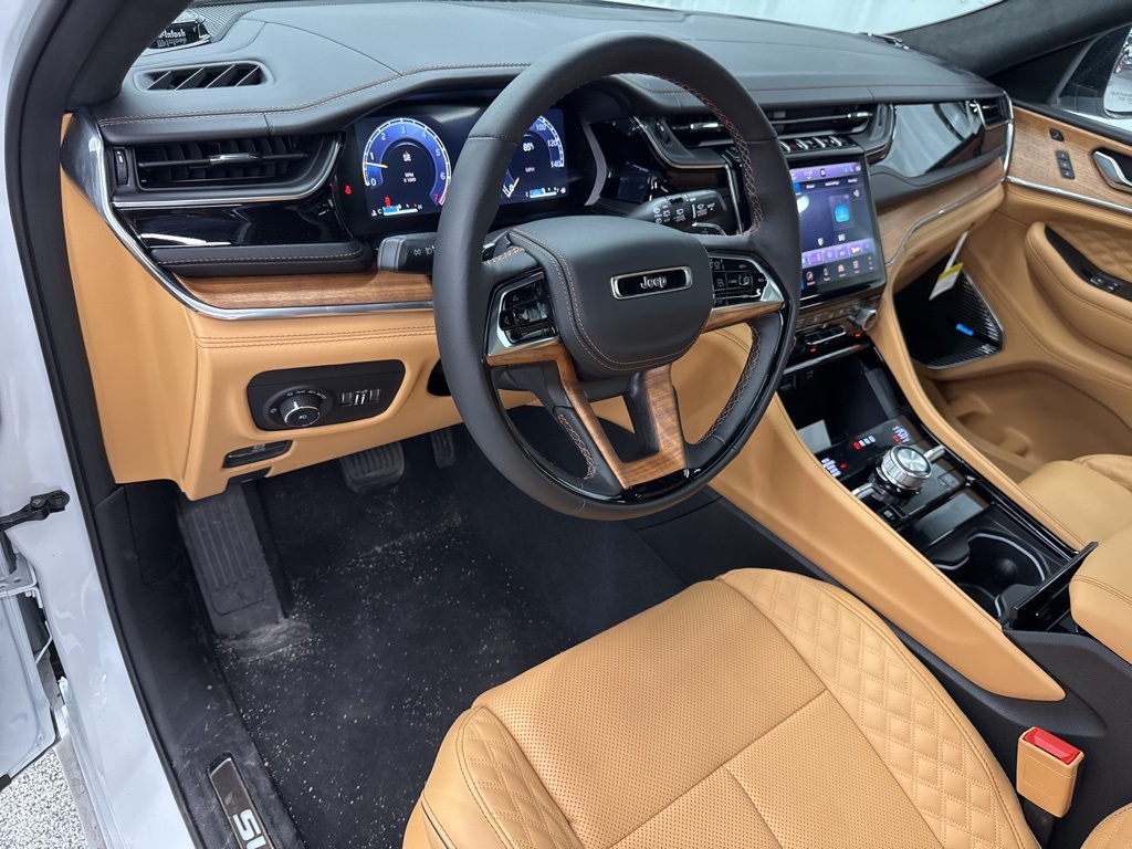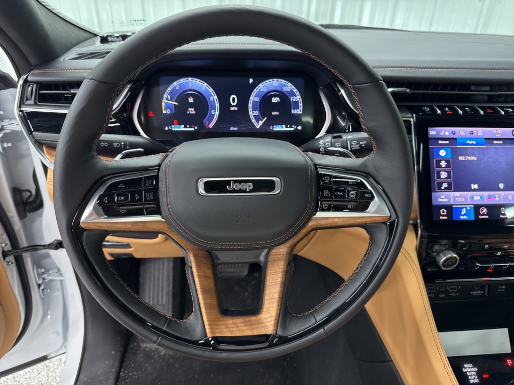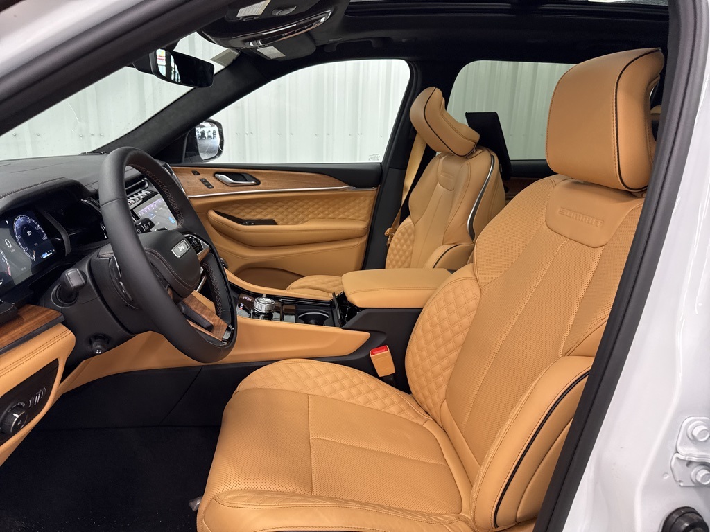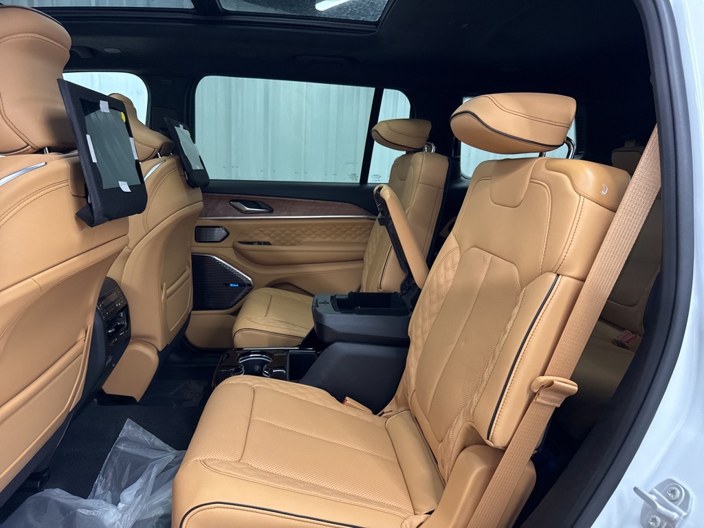 Exterior Accents, Neutral Gray Exterior Accents, Painted Door Cladding, and Wheels: 21" x 9" Black Painted Aluminum), MOPAR Finishing Package (MOPAR Front Splash Guards, MOPAR Paint Protection Film, and MOPAR Rear Splash Guards w/Jeep Logo), Quick Order Package 23U Summit Reserve (19 Speakers High Performance Audio, 950 Watt Amplifier, Active Noise Control System, Deluxe Headliner, Front Passenger Interactive Display, Palermo Leather Door Trim, Palermo Leather Seats, Summit, Summit Badge, Ventilated Rear Seats, and Wheels: 21" x 9.0" Machined Face/Painted Aluminum), Rear Seat Video Group I (Amazon Fire TV Built-In, Seatback Video Screens, and Video USB Port), Two Tone Paint Group, 10 Speakers, 3.45 Rear Axle Ratio, 3rd row seats: split-bench, 4-Wheel Disc Brakes, ABS brakes, Adaptive suspension, Air Conditioning, Alloy wheels, AM/FM radio: SiriusXM with 360L, Anti-whiplash front head restraints, Audio memory, Auto High-beam Headlights, Auto-dimming door mirrors, Auto-dimming Rear-View mirror, Auto-leveling suspension, Automatic temperature control, Brake assist, Bumpers: body-color, Compass, Delay-off headlights, Driver door bin, Driver vanity mirror, Dual front impact airbags, Dual front side impact airbags, Electronic Stability Control, Emergency communication system, Four wheel independent suspension, Front anti-roll bar, Front Bucket Seats, Front Center Armrest w/Storage, Front dual zone A/C, Front fog lights, Front License Plate Bracket, Front reading lights, Fully automatic headlights, Garage door transmitter, Genuine wood dashboard insert, Genuine wood door panel insert, Heated door mirrors, Heated front seats, Heated rear seats, Heated steering wheel, Illuminated entry, Knee airbag, Leather steering wheel, Low tire pressure warning, Memory seat, Model Year Tracking, Nappa Leather Seats, Navigation System, Normal Duty Suspension, Occupant sensing airbag, Outside temperature display, Overhead airbag, Overhead console, Panic alarm, Passenger door bin, Passenger vanity mirror, Power door mirrors, Power driver seat, Power Fold Seatbacks, Power Liftgate, Power moonroof, Power passenger seat, Power steering, Power windows, Radio data system, Radio: Uconnect 5 Nav w/10.1" Display, Rain sensing wipers, Rear air conditioning, Rear anti-roll bar, Rear dual zone A/C, Rear reading lights, Rear seat center armrest, Rear window defroster, Rear window wiper, Reclining 3rd row seat, Remote keyless entry, Security system, Speed control, Speed-Sensitive Wipers, Split folding rear seat, Spoiler, Steering wheel memory, Steering wheel mounted audio controls, Tachometer, Telescoping steering wheel, Tilt steering wheel, Traction control, Trip computer, Turn signal indicator mirrors, Variably intermittent wipers, Ventilated front seats, Voltmeter, and Wheels: 20" x 8.5" Fully Painted Aluminum Silver.
