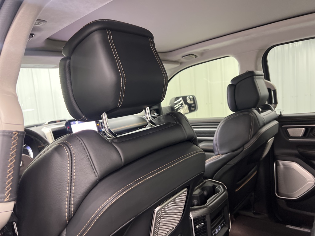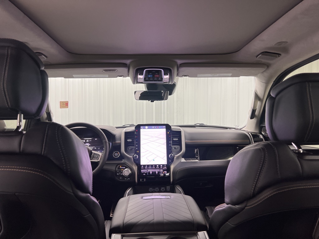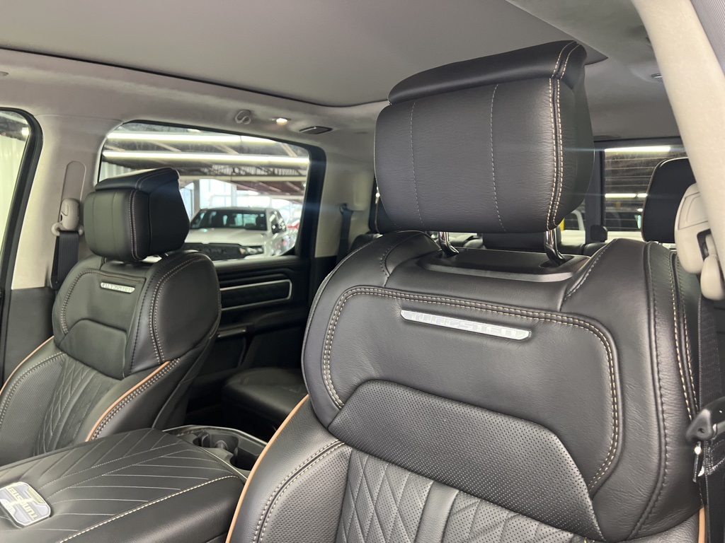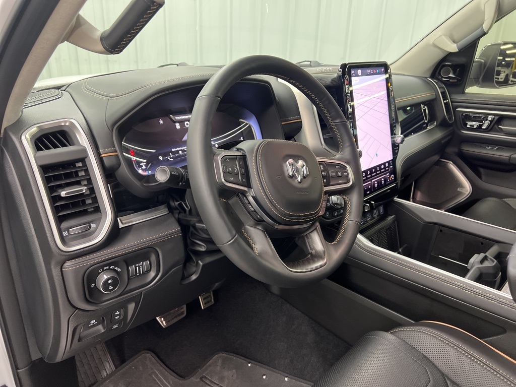 ay/1-Way Trailer Connector, 3.92 Rear Axle Ratio, 4-Wheel Disc Brakes, ABS brakes, Adjustable pedals, Air Conditioning, Alloy wheels, AM/FM radio, Apple CarPlay/Android Auto, Audio memory, Auto High-beam Headlights, Auto Power-Folding Mirrors, Auto-dimming door mirrors, Auto-Dimming Exterior Driver Mirror, Auto-dimming Rear-View mirror, Auto-leveling suspension, Automatic temperature control, Bodyside moldings, Brake assist, Bumpers: body-color, Chrome Exterior Mirrors, Compass, Delay-off headlights, Driver door bin, Driver vanity mirror, Dual front impact airbags, Dual front side impact airbags, Electronic Stability Control, Exterior Mirrors Courtesy Lamps, Exterior Mirrors with Heating Element, Exterior Mirrors with Memory, Exterior Mirrors with Supplemental Signals, Exterior Parking Camera Rear, Front anti-roll bar, Front Bucket Seats, Front Center Armrest w/Storage, Front dual zone A/C, Front fog lights, Front License Plate Bracket, Front reading lights, Front wheel independent suspension, Fully automatic headlights, Garage door transmitter, Heads-Up Display, Heated door mirrors, Heated front seats, Heated rear seats, Heated steering wheel, Illuminated entry, Leather steering wheel, Low tire pressure warning, Memory seat, Multi-Function Tailgate, Navigation System, Occupant sensing airbag, Outside temperature display, Overhead airbag, Overhead console, Panic alarm, Passenger door bin, Passenger vanity mirror, Pedal memory, Power adjustable front head restraints, Power door mirrors, Power driver seat, Power moonroof, Power passenger seat, Power steering, Power windows, Premium Leather Bucket Seats, Radio data system, Radio: Uconnect 5 Nav with 14.4" Display, Rain sensing wipers, RAM's Head Badge, Rear anti-roll bar, Rear reading lights, Rear seat center armrest, Rear step bumper, Rear window defroster, Remote keyless entry, Remote Tailgate Release, Security system, Speed control, Split folding rear seat, Steering wheel mounted audio controls, Tachometer, Telescoping steering wheel, Tilt steering wheel, Traction control, Trailer Brake Control, Trip computer, Turn signal indicator mirrors, Variably intermittent wipers, Ventilated front seats, Ventilated rear seats, Voltmeter, and Wheels: 22" x 9" Polish/Painted with Inserts.