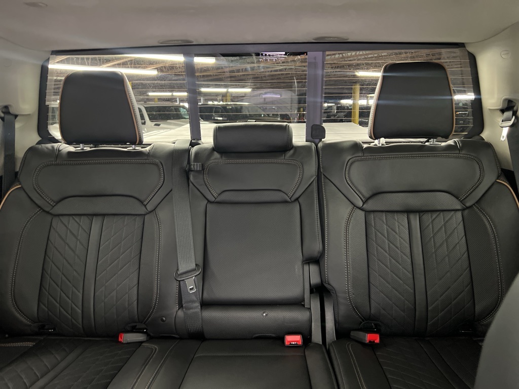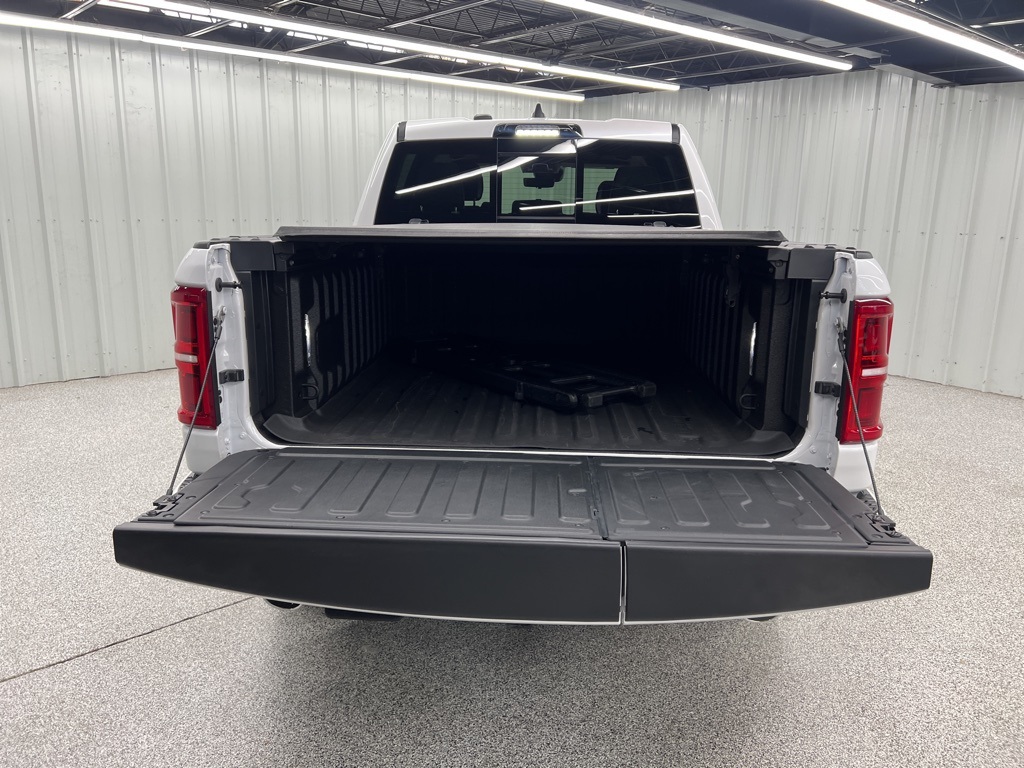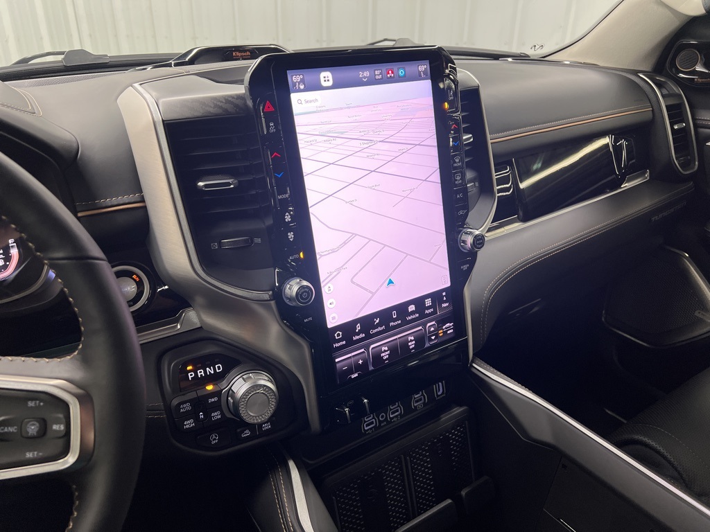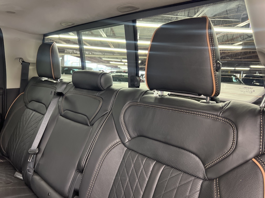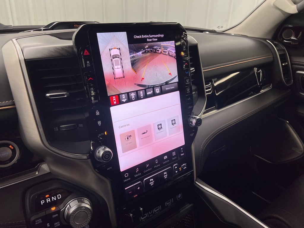 ay/1-Way Trailer Connector, 3.92 Rear Axle Ratio, 4-Wheel Disc Brakes, ABS brakes, Adjustable pedals, Air Conditioning, Alloy wheels, AM/FM radio, Apple CarPlay/Android Auto, Audio memory, Auto High-beam Headlights, Auto Power-Folding Mirrors, Auto-dimming door mirrors, Auto-Dimming Exterior Driver Mirror, Auto-dimming Rear-View mirror, Auto-leveling suspension, Automatic temperature control, Bodyside moldings, Brake assist, Bumpers: body-color, Chrome Exterior Mirrors, Compass, Delay-off headlights, Driver door bin, Driver vanity mirror, Dual front impact airbags, Dual front side impact airbags, Electronic Stability Control, Exterior Mirrors Courtesy Lamps, Exterior Mirrors with Heating Element, Exterior Mirrors with Memory, Exterior Mirrors with Supplemental Signals, Exterior Parking Camera Rear, Front anti-roll bar, Front Bucket Seats, Front Center Armrest w/Storage, Front dual zone A/C, Front fog lights, Front License Plate Bracket, Front reading lights, Front wheel independent suspension, Fully automatic headlights, Garage door transmitter, Heads-Up Display, Heated door mirrors, Heated front seats, Heated rear seats, Heated steering wheel, Illuminated entry, Leather steering wheel, Low tire pressure warning, Memory seat, Multi-Function Tailgate, Navigation System, Occupant sensing airbag, Outside temperature display, Overhead airbag, Overhead console, Panic alarm, Passenger door bin, Passenger vanity mirror, Pedal memory, Power adjustable front head restraints, Power door mirrors, Power driver seat, Power moonroof, Power passenger seat, Power steering, Power windows, Premium Leather Bucket Seats, Radio data system, Radio: Uconnect 5 Nav with 14.4" Display, Rain sensing wipers, RAM's Head Badge, Rear anti-roll bar, Rear reading lights, Rear seat center armrest, Rear step bumper, Rear window defroster, Remote keyless entry, Remote Tailgate Release, Security system, Speed control, Split folding rear seat, Steering wheel mounted audio controls, Tachometer, Telescoping steering wheel, Tilt steering wheel, Traction control, Trailer Brake Control, Trip computer, Turn signal indicator mirrors, Variably intermittent wipers, Ventilated front seats, Ventilated rear seats, Voltmeter, and Wheels: 22" x 9" Polish/Painted with Inserts.