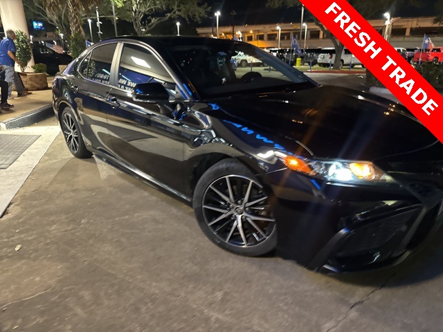 Clean CARFAX. Midnight Black Metallic 2023 Toyota Camry SE Nightshade FWD 8-Speed Automatic 2.5L I4 DOHC 16V LOCAL TRADE, NON SMOKER, KEYLESS ENTRY, REMOTE START, APPLE CARPLAY, ANDROID AUTO, SIRIUS XM RADIO, AM/FM/HD RADIO, BLUETOOTH HANDS FREE CALLING, FRONT USB CHARGING PORTS, MP3 IPOD COMPATIBLE, AUTO HEADLIGHTS, DAYTIME RUNNING LIGHTS, BLIND SPOT WARNING SYSTEM, LANE DEPARTURE WARNING SYSTEM, POWER ADJUSTABLE DRIVERS SEAT, Black w/Perforated Leather Seat Trim.
