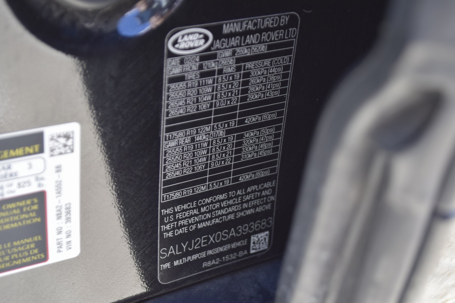 Black 2025 Land Rover Range Rover Velar S AWD 8-Speed Automatic 2.0L I4 Turbocharged 3D Surround Camera, Emergency Pack, Head-Up Display, Park Assist, Power Liftgate, Power moonroof, Technology Package, Wade Sensing, Wheel Protection Pack Black Locks/Lugs.