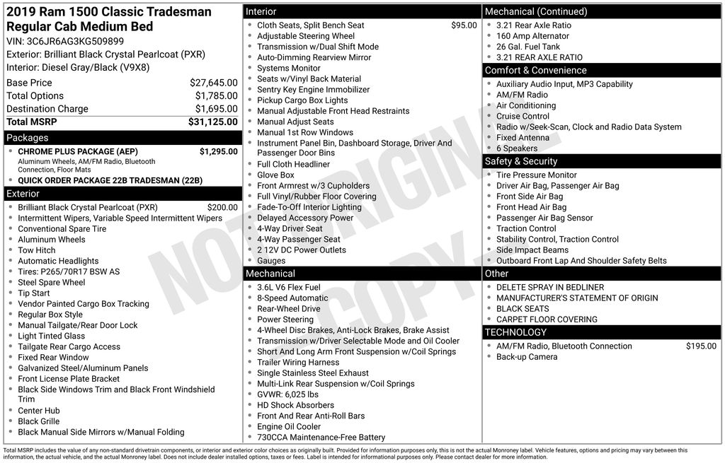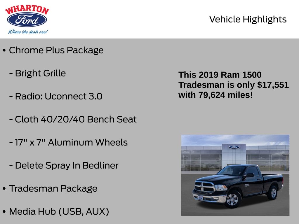 Brilliant Black Crystal Pearlcoat 2019 Ram 1500 Classic Tradesman RWD 8-Speed Automatic 3.6L V6 24V VVT 17" x 7" Aluminum Wheels, 40/20/40 Split Bench Seat, Body Color Upper Fascia, Brake assist, Bright Front Bumper, Bright Grille, Bright Rear Bumper, Carpet Floor Covering, Center Hub, Chrome Plus Package, Cloth 40/20/40 Bench Seat, Delete Spray In Bedliner, Front Armrest w/3 Cupholders, Front Floor Mats, Integrated Voice Command w/Bluetooth, Manual Adjust Seats, Media Hub (USB, AUX), ParkView R